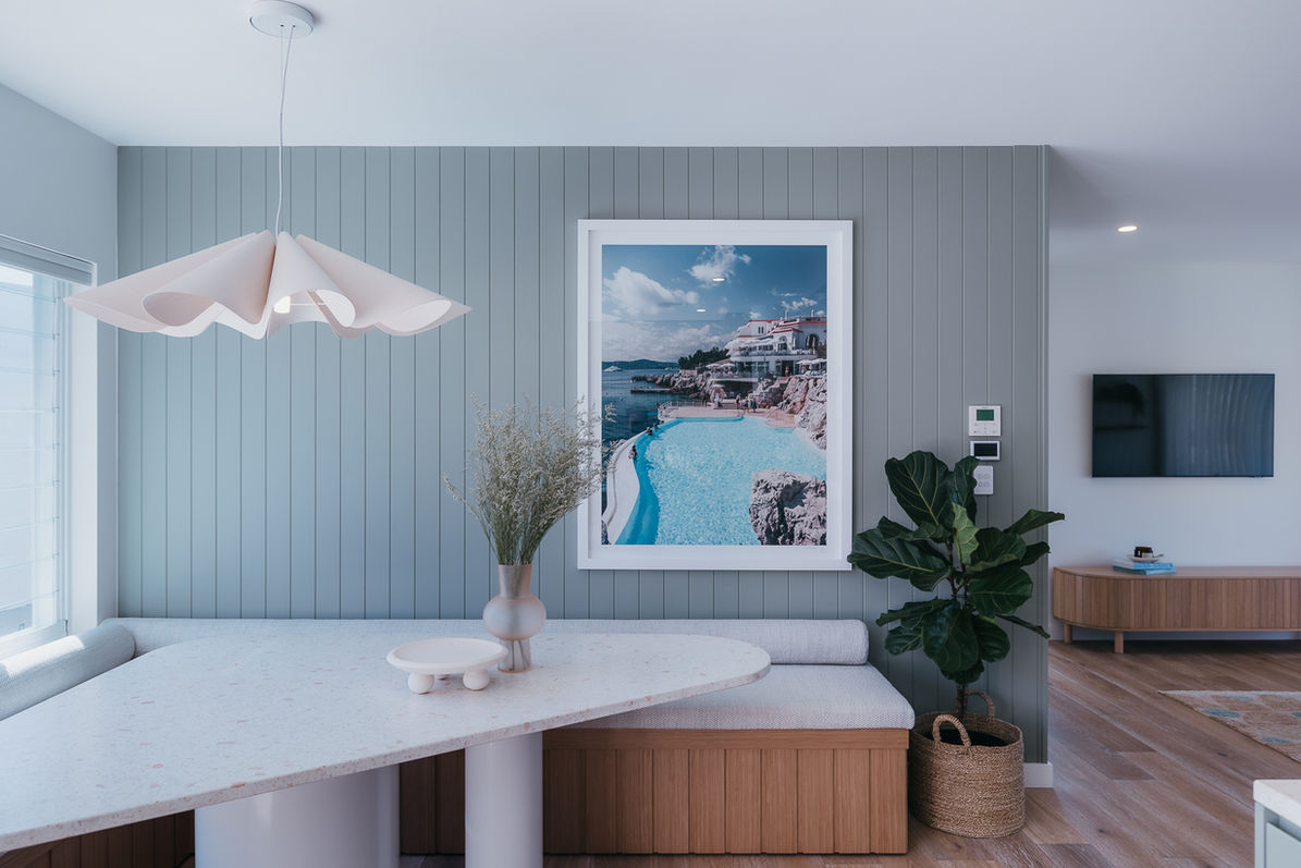 Surrounded by calming waves, warm sand and coastal pines, this family beachside retreat has been designed to complement its environment. A soothing external palette allows the home to sit harmoniously alongside the landscape. Pops of soft green and earthy nudes blended with organic textures throughout the interior creates a cosy and playful space to relax and enjoy.